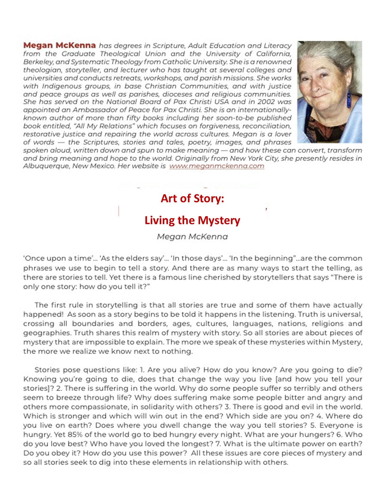 Megan Mckenna tells wonderful stories in this book of persons whom she met through her travels, teachings and spiritual retreats who have changed her life. Many were poor but rich in God’s love and presence. These encounters, oftentimes unexpected, Megan describes as blessings, moments of “being caught off guard by God’s eyes looking straight at me, through the eyes of people I met.”